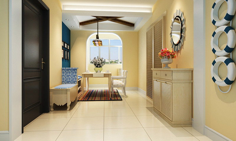 案例說明 業主喜愛地中海的家居感覺。因此在硬裝修上,整個地面運用了仿古地磚做拼貼飾面,以及仿古的沙發、歐式的茶幾、臺燈,共同營造溫馨祥和的氣氛。